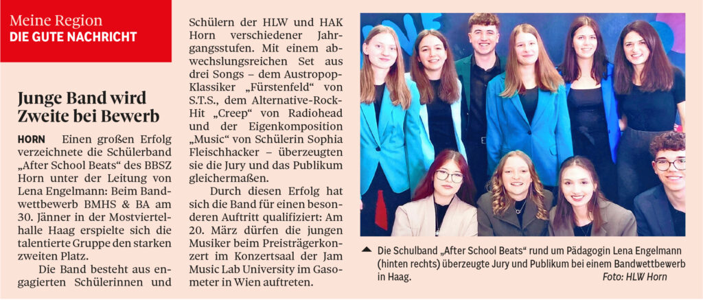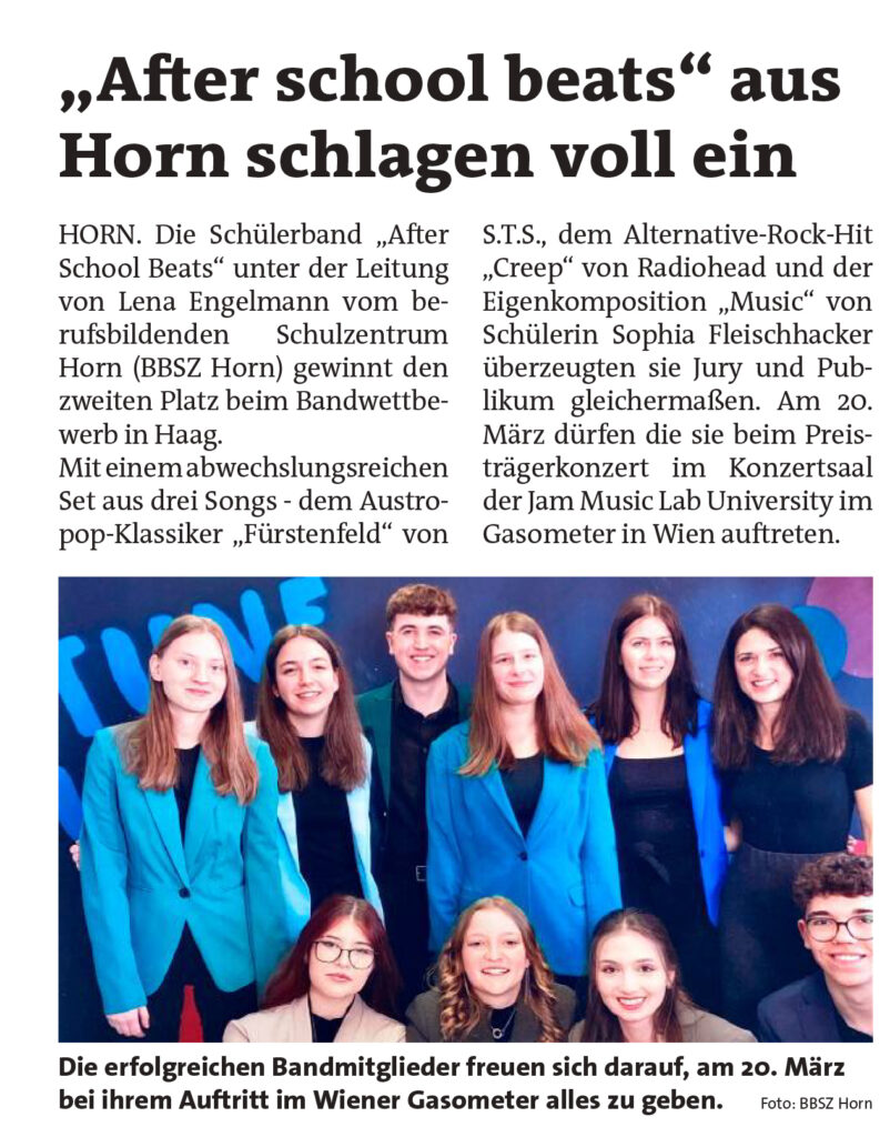 Einen großen Erfolg verzeichnete die Schülerband „After School Beats“ des BBSZ Horn unter der Leitung von Lena Engelmann: Beim Bandwettbewerb BMHS & BA am 30. Jänner in der Mostviertelhalle Haag erspielte sich die talentierte Gruppe den starken zweiten Platz.