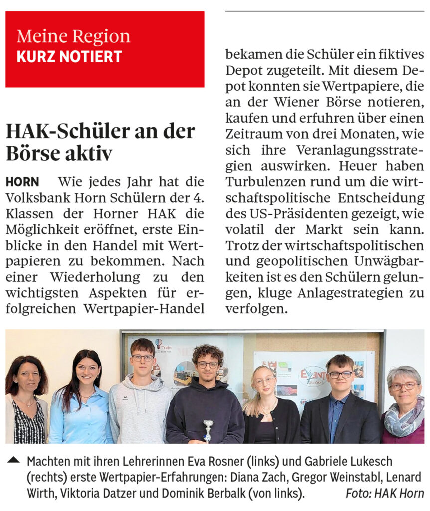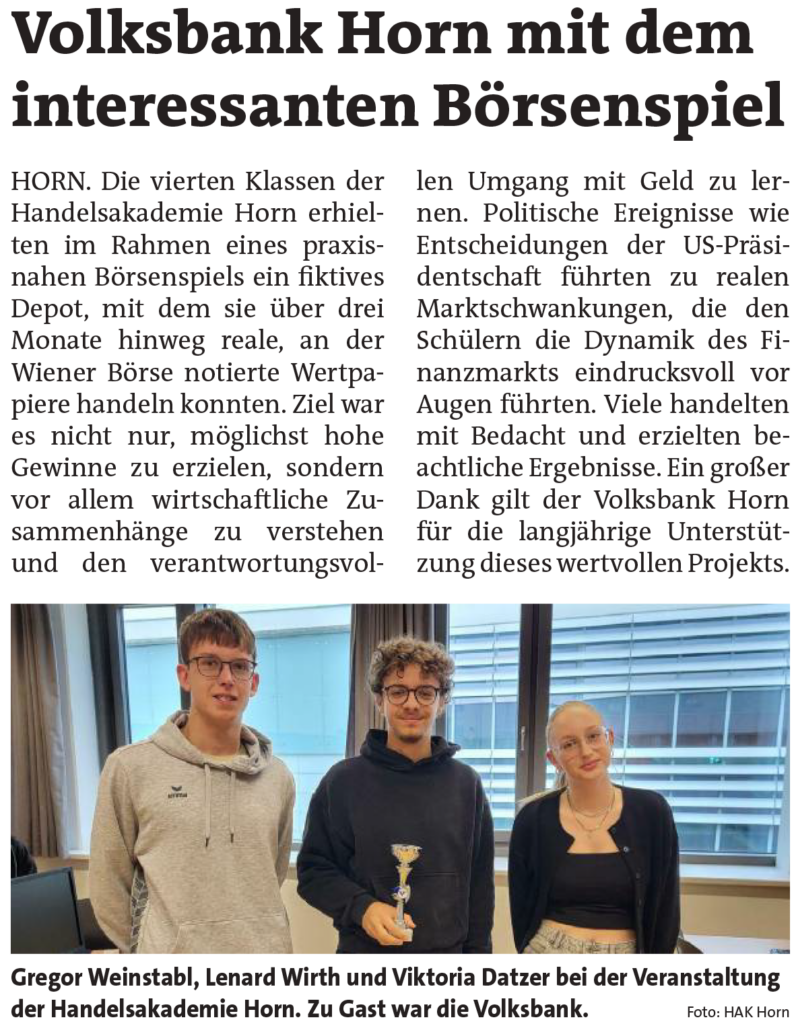 Wie jedes Jahr hat uns die Volksbank Horn eine großartige Möglichkeit eröffnet, um Schüler.innen der 4. Jahrgänge der BHAK-Horn erste Einblicke in den Handel mit Wertpapieren zu gewähren.