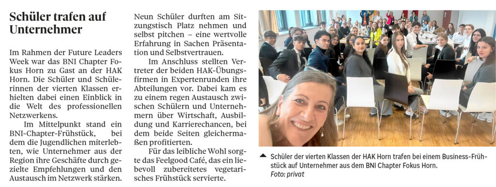Das Businessnetzwerk International, Chapter Horn, hat sein wöchentliches Businessfrühstück diesmal in den Räumlichkeiten der BHAK Horn abgehalten. Die Veranstaltung bot Unternehmer:innen wie gewohnt die Möglichkeit, in einem Timeslot von jeweils 45 Minuten Neuigkeiten aus ihren Unternehmen zu präsentieren.