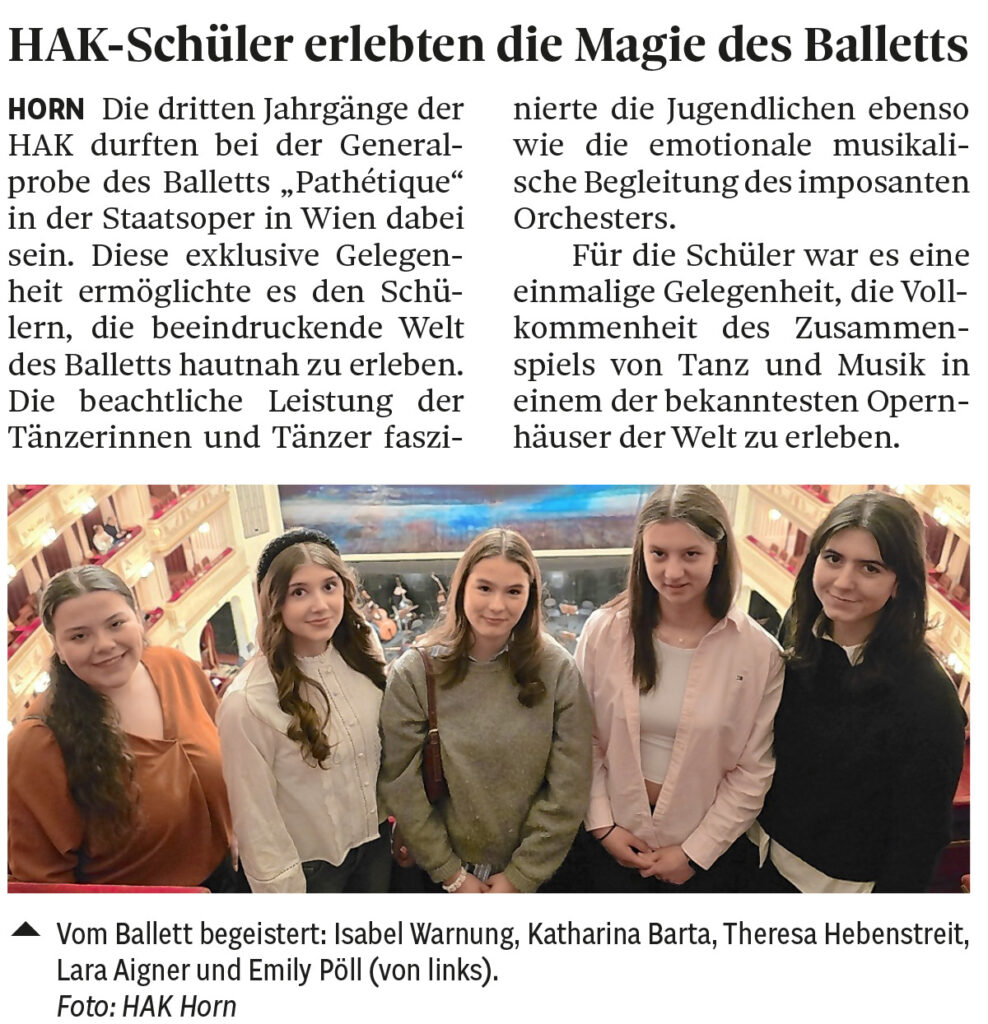 Die dritten Jahrgänge der HAK durften bei der Generalprobe dabei sein. Diese exklusive Gelegenheit ermöglichte es den Schülerinnen und Schülern, die beeindruckende Welt des Balletts hautnah zu erleben. Die beachtliche Leistung der Tänzerinnen und Tänzer faszinierte ebenso wie die emotionale musikalische Begleitung des imposanten Orchesters.