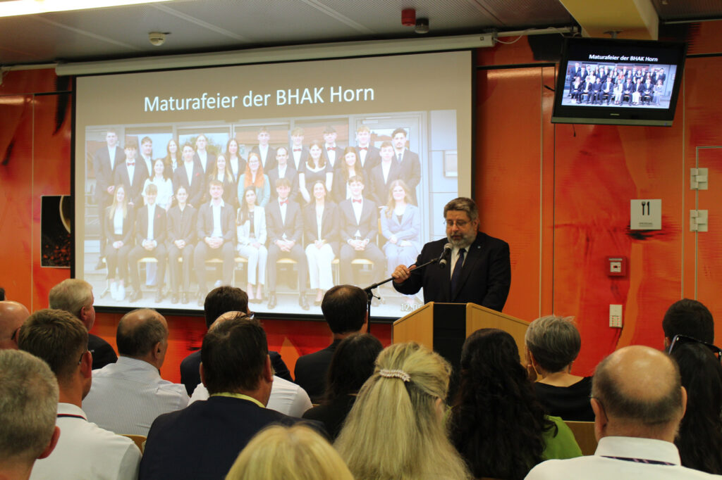 Horn, 12. Juni 2025 – Mit einer stimmungsvollen Feier verabschiedete die BHAK/BHAS Horn am Abend des 12. Juni ihre erfolgreichen Maturantinnen und Maturanten des Jahrgangs 2025. Direkt im Anschluss an die letzten mündlichen Prüfungen fanden sich Schüler: innen, Lehrkräfte, Familien und Ehrengäste um 18:00 Uhr in der Aula der Schule ein, um gemeinsam auf die vergangenen fünf Jahre zurückzublicken und die erbrachten Leistungen zu würdigen.