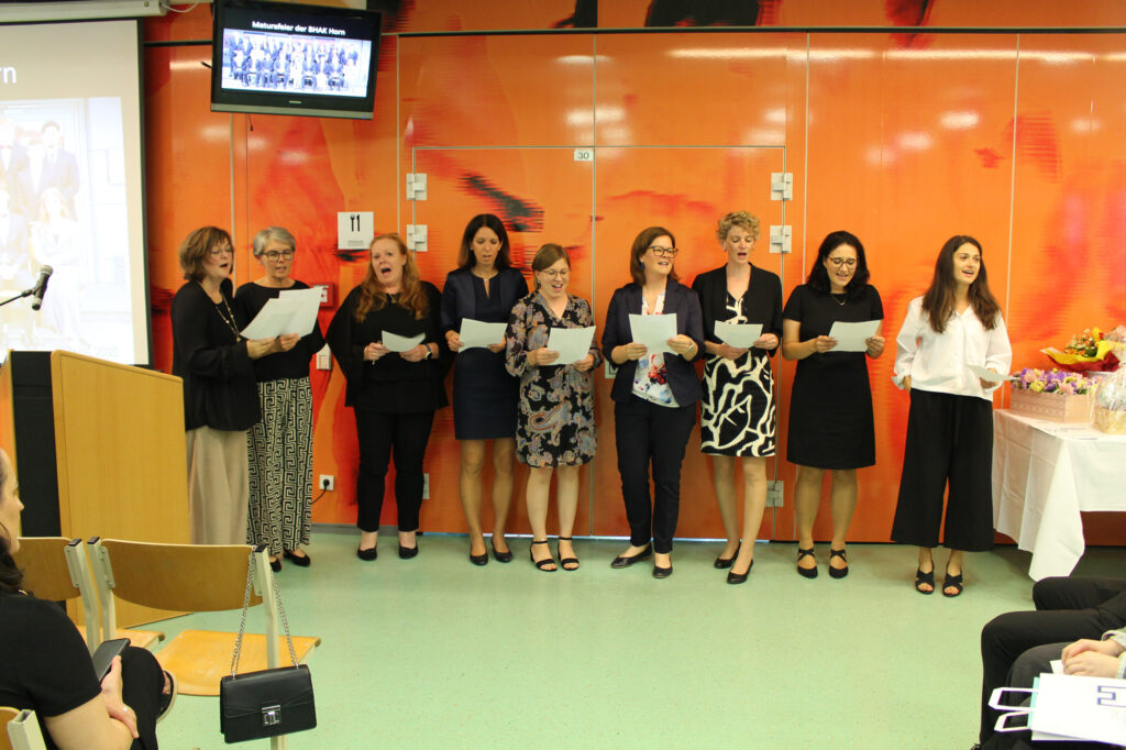 Der musikalische Rahmen wurde heuer von zwei jungen Talenten gestaltet: Eine Schülerin der 2. Klasse HAK und eine Schülerin, die im kommenden Schuljahr an die HAK wechseln wird, begeisterten mit gefühlvollen Darbietungen. Der Lehrer: innenchor verabschiedete die Absolvent: innen mit traditionellen irischen Segenswünschen in ihren neuen Lebensabschnitt.