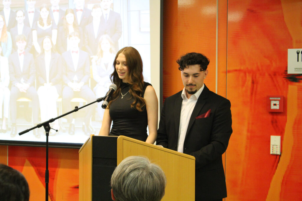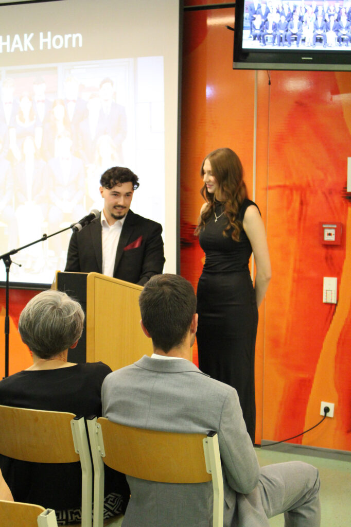 Zum Abschluss ließen die beiden Klassensprecher: innen, Nicole Hofbauer (5AK) und Arian Sylejmani (5BK), die letzten fünf Schuljahre mit viel Charme, Dankbarkeit und einem Augenzwinkern Revue passieren. Dabei richteten sie ihren besonderen Dank an die Lehrkräfte, Eltern und Wegbegleiter: innen.
