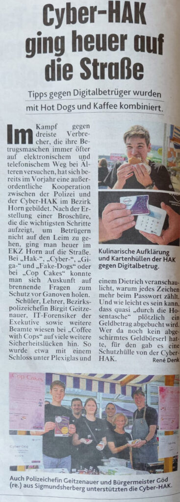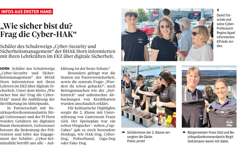 Am 13. Juni 2025  Nachmittag informierten die Schülerinnen und Schüler des Schulzweigs „Cyber-Security und Sicherheitsmanagement“ der BHAK Horn mit ihren Lehrkräften im EKZ über digitale Sicherheit. Unter dem Motto „Wie sicher bist du? Frag die Cyber-HAK“ stand die Aufklärung der Bevölkerung im Mittelpunkt.